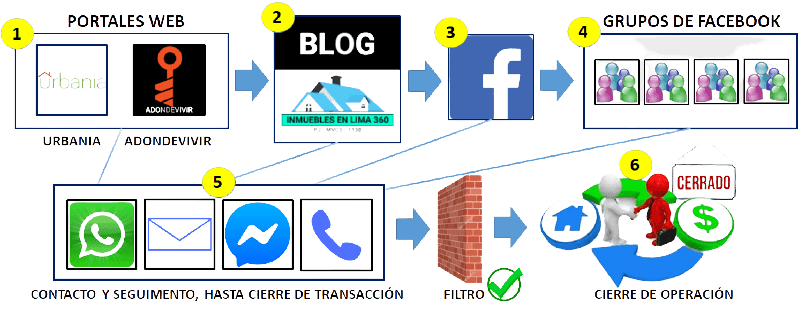 Y una vez determinado el tipo de inmueble, contigo procederemos al llenado de 1 ficha destinada a establecer los detalles de tu requerimiento, en cuanto a su ubicación, descripción, características, y condiciones con las que procederemos a promover la venta, por diversos medios, como Portales de Inmuebles, éste Blog, nuestra página de Negocios y variedad de Grupos de Facebook, con los que veremos que cerrar con éxito su venta, tal como se muestra en éste Flujo del Proceso de Marketing en pro de la Venta: